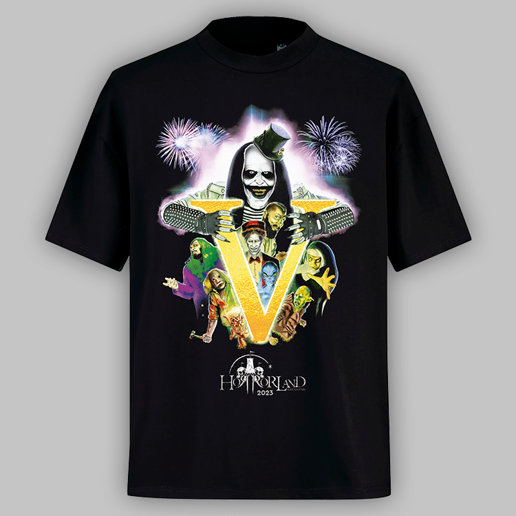 La camiseta VIP oficial de Horrorland 2023. Camiseta de algodón en color negro con el logo de Horrorland, año y personajes icónicos de la edición.