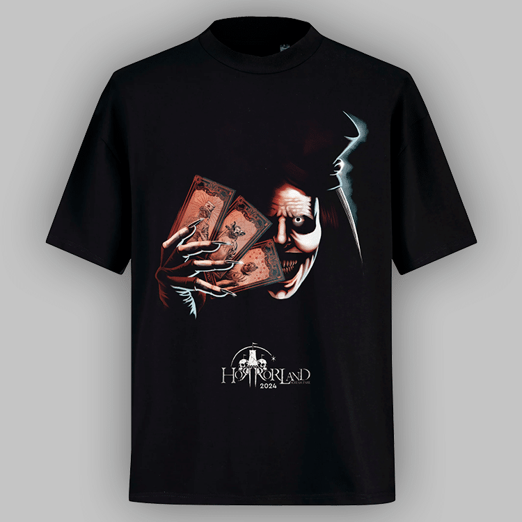 La camiseta VIP oficial de Horrorland 2024. Camiseta de algodón en color negro con el logo de Horrorland, año y Mortimer con cartas de tarot.
